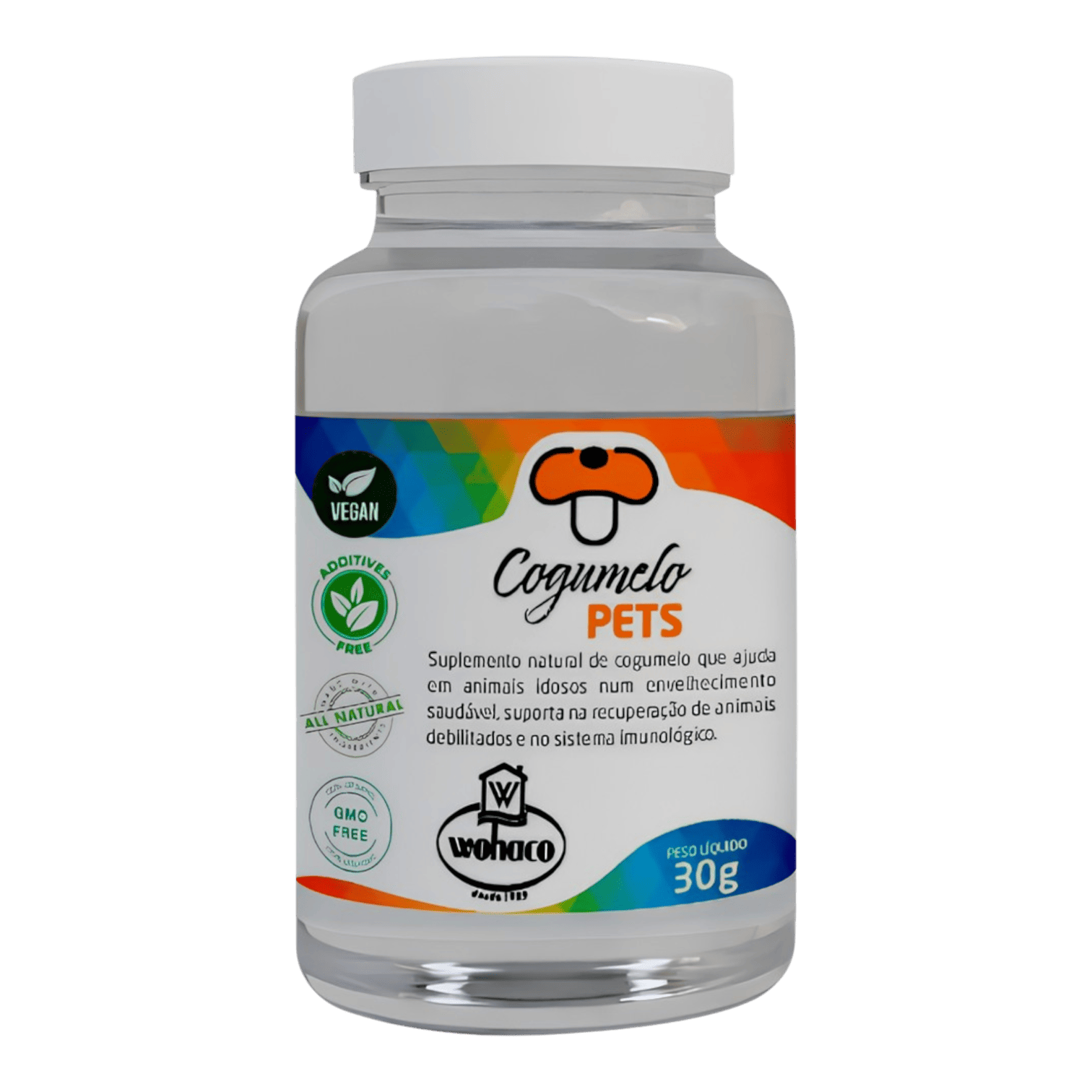 Cogumelo Pets Wohaco Vet, suplemento de cogumelo para cães e gatos, Cordyceps militaris pet, suplemento natural para imunidade pet, antioxidante natural para cães e gatos, suplemento funcional Wohaco Vet, saúde natural para pets, apoio à imunidade pet, suplemento em pó para cães e gatos