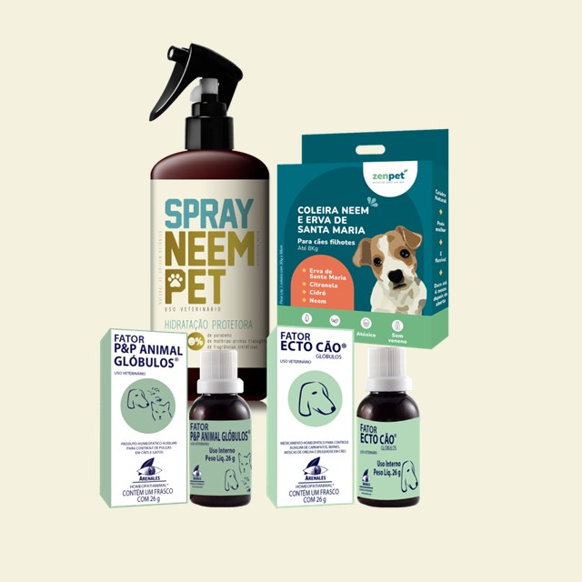 Este kit combina quatro produtos complementares: coleira natural repelente Zenpet, spray neem pet repelente natural, Fator Pulga Arenales e Fator Ecto Arenales.